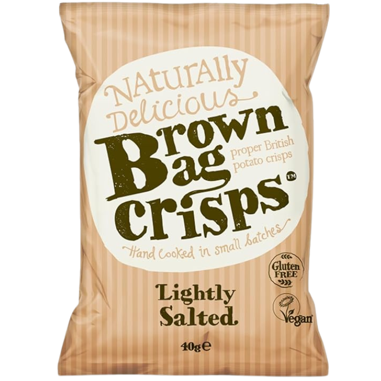 Brown Bag Crisps (Lightly Salted) are hand-cooked British potato crisps made using carefully selected potatoes and lightly seasoned with sea salt for a perfectly crisp, natural potato taste.