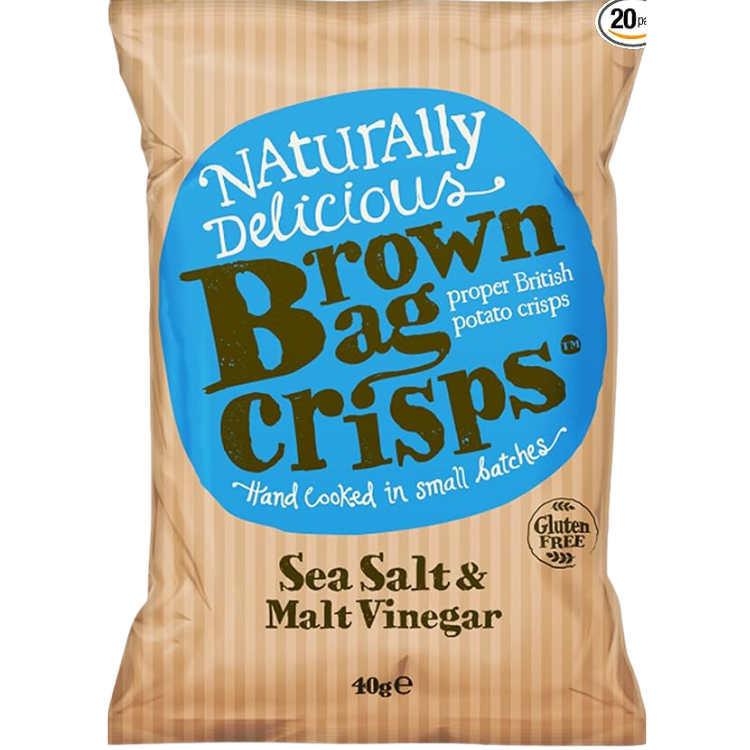 Brown Bag Crisps (Salt & Vinegar) are hand-cooked British potato crisps made from carefully selected potatoes, seasoned with tangy vinegar and sea salt for a bold, classic flavour.
