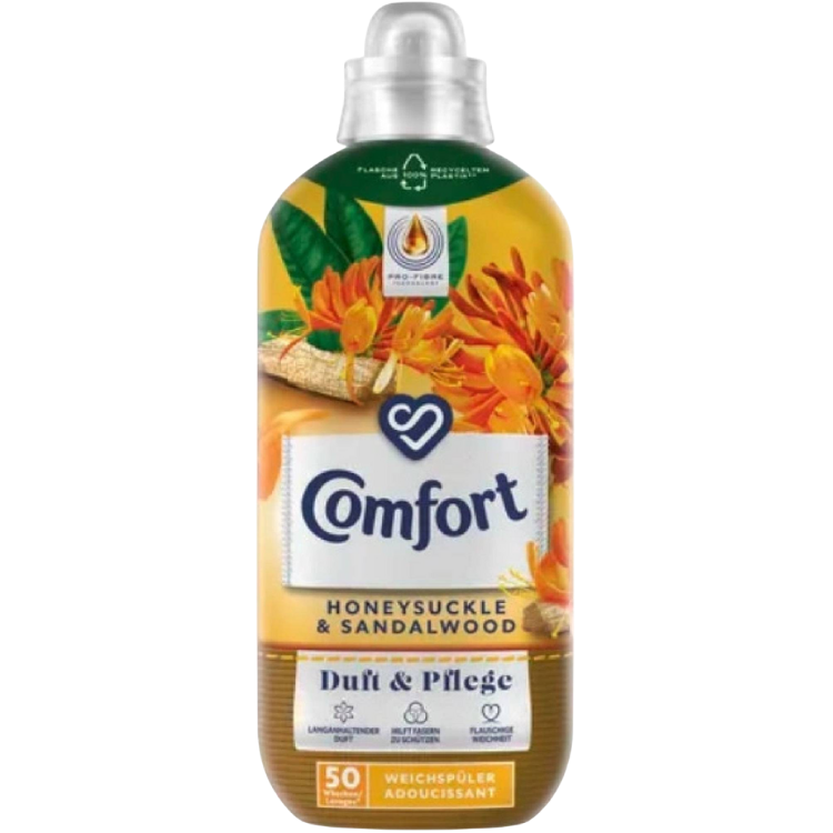 Comfort Honeysuckle & Sandalwood fabric softener provides long-lasting freshness with a warm floral-woody aroma. Its Pro-Fibre formula helps protect fabric fibres, maintain brightness, and keep clothes soft and smooth wash after wash. Suitable for all fabrics and ideal for daily laundry.