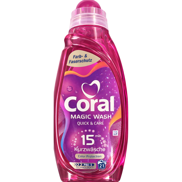 Coral Pink Magic Wash Quick & Care delivers fast and gentle cleaning in just 15 minutes. It protects colors, maintains fabric quality, and keeps clothes looking fresh. With a concentrated formula for up to 21 washes, it ensures long-lasting brightness and softness for mixed and colored laundry.