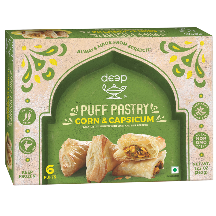 Crispy, flaky, and bursting with flavour, Deep Puff Pastry Corn & Capsicum features golden pastry pockets filled with a savoury mix of sweet corn and bell peppers in a mildly spiced masala. Perfect as an appetizer, tea-time snack, or party treat — just heat and enjoy.