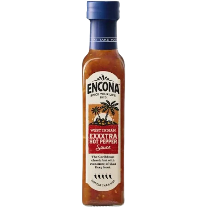 Elevate your dishes with the fiery combination of scotch bonnet, habanero, and bhut jolokia chilies in Encona's West Indian Extra Hot Pepper Sauce (142 ml). Originating from the West Indies, this sauce is rated as "extra hot - 4" and contains no added MSG. Suitable for vegetarians and vegans, it's the perfect addition to any dish in need of an extra kick.