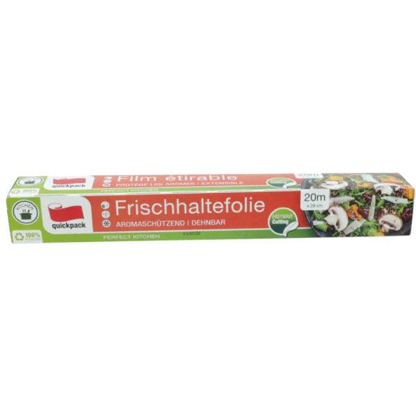 Quickpack Frischhaltefolie – 20 m is a high-quality, stretchable cling film that keeps your food fresh and aromatic. Ideal for wrapping fruits, vegetables, sandwiches, or leftovers, this transparent film tightly seals and protects against odors and moisture. Convenient for everyday kitchen use.