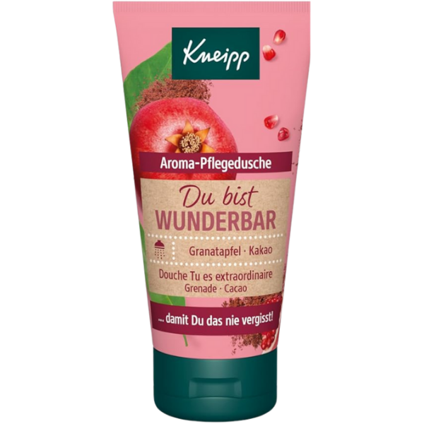 Kneipp Aroma Shower Gel Du bist Wunderbar is a pampering shower gel formulated with pomegranate and cocoa extract, ideal for a feel-good, nourishing shower experience.Its fruity-sweet fragrance uplifts the mood and provides a soft, comforting scent on the skin. Pomegranate extract helps protect skin moisture, while cocoa extract gives a soothing and silky skin feel.