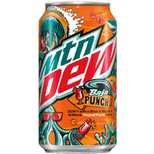 Introducing Mountain Dew Baja Punch - a refreshing blend of tropical flavors in a convenient 355 ml can. Enjoy the perfect balance of fruitiness and fizzy carbonation, giving you a delightful taste experience with every sip. Perfect for on-the-go refreshment or to quench your thirst during outdoor activities.