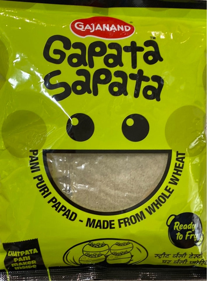 Pani Puri Papad Gapata Sapata – 200 g – Crispy, ready-to-fry whole wheat pani puri pellets for homemade golgappa/puchka. Comes with a sachet of chatpata masala to quickly prepare tangy tamarind-mint pani—ideal for fuss-free gatherings or street-style snacking at home.