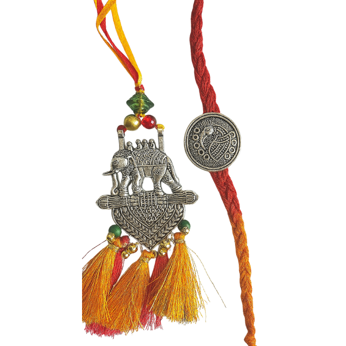 Celebrate Raksha Bandhan with this majestic Royal Elephant Charm Rakhi & Lumba Set. The set features a beautifully detailed oxidized silver-tone elephant charm on the Lumba, paired with bright yellow and red tassels and multicolored beads. The Rakhi is crafted with a traditional braided thread and an engraved silver medallion, symbolizing cultural richness and sibling love.