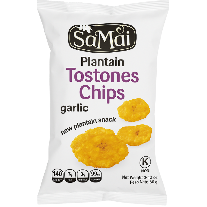 Crispy, golden, twice-fried plantain slices seasoned with a savoury garlic kick. Samai’s Tostones Chips are made from fresh, hand-picked plantains and cooked in small batches for maximum crunch. A delicious Latin-American snack that’s naturally gluten-free, non-GMO, and perfect to enjoy on the go or with dips.